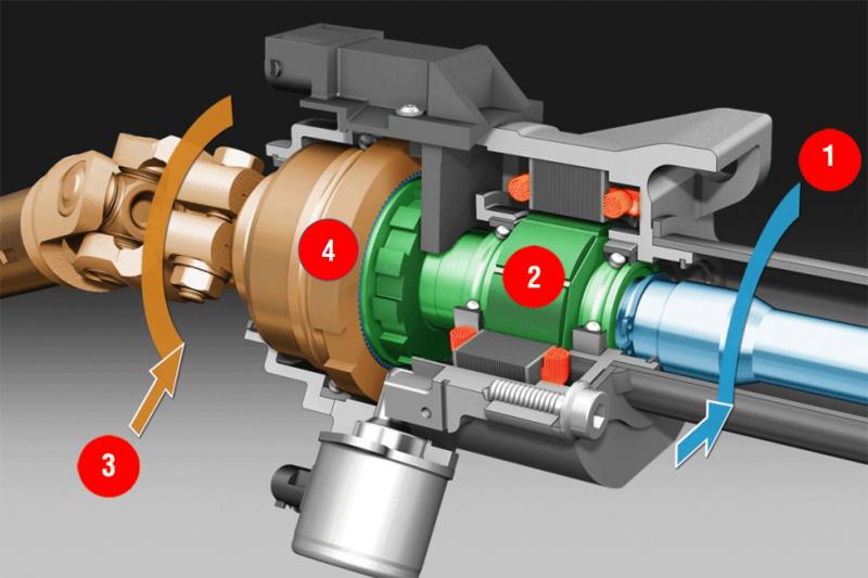 1 - bemenő tengely a kormánykeréktől, 2 - a hullámhajtóművet hajtó villanymotor, 3 - kimenőtengely a kormánygéphez, 4 - hullámhajtómű