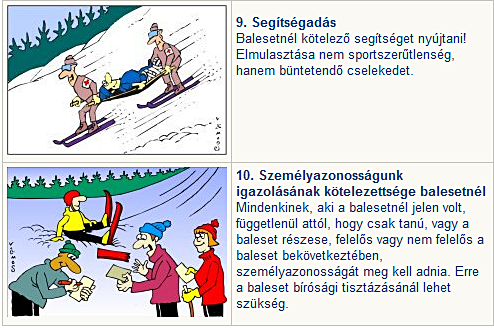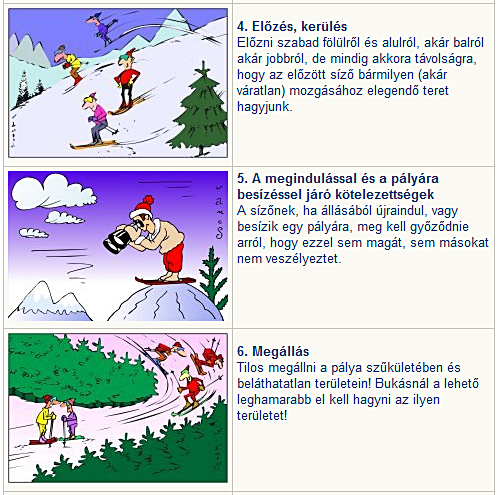 A sípályát használókra vonatkozó rendszabályokat akár az első helyre is tehettük volna, de jelen esetben a logikai sorrend - miszerint megfelelő felszereléssel, épségben, egészségben jussunk el a kívánt helyre - miatt kaptak elsőbbséget az eddig felsoroltak. A sí-kresz lényegét a közlekedőkre vonatkozó általános témakörök szerint csoportosíthatjuk: (A mellékelt képeken szereplő illusztrációk Vámos Sándor rajzai)