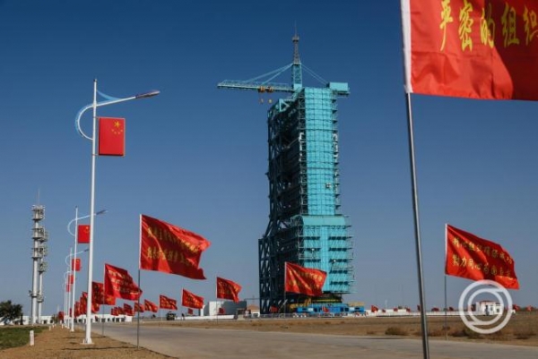 A Sencsou-21 űrutazás űrhajója és hordozórakétája a kilövőálláson október 30-án. Fotó: MTI/EPA/Vu Hao