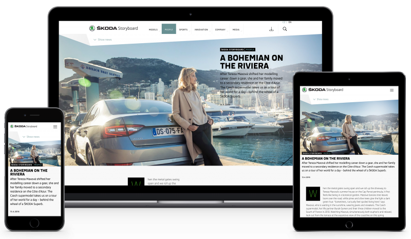 A látványos és naprakész tartalmak mellett a ŠKODA Storyboard modern és felhasználóbarát felülete tökéletesen illeszkedik a vállalat kristályüveget idéző új formai nyelvezetébe. A Responsive Web Design segítségével pedig az oldal minden eszközön elérhető, legyen szó asztali számítógépről, tabletről vagy okostelefonról.