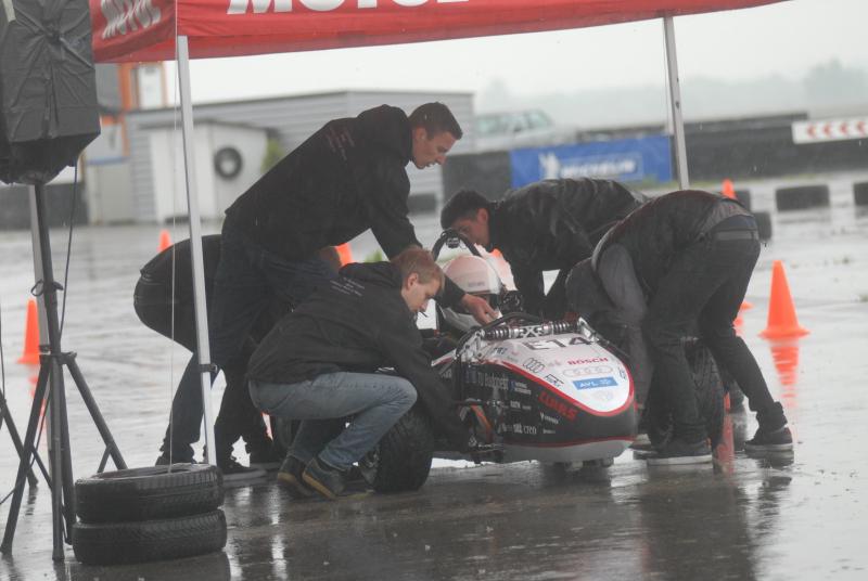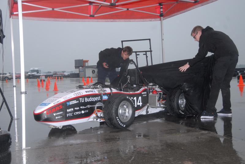 Van a Formula Student sorozat versenyeknek egy olyan része, ahol az autók szigetelését vizsgálják, ilyenkor egyszerűen speciális zuhany alá állítják a gépet, és ha megfelelt, akkor mehet a további ellenőrzésekre. A gépátvételi esőteszt semmi ahhoz képest, amit a természet produkált amikor a Budaesti Műszaki Egytem csapata a tököli repülőtéren bemutatta legújabb villanyautóját. Ez nem volt meglepetés, hiszen az időjárási előrejelzések alapos égzengésről szóltak. Erről persze a program tervezésekor még nem lehetett tudni, ahogy az sem szerepelt a meghívón, amit a kétszáznál több megjelent vendég látott égen és földön.