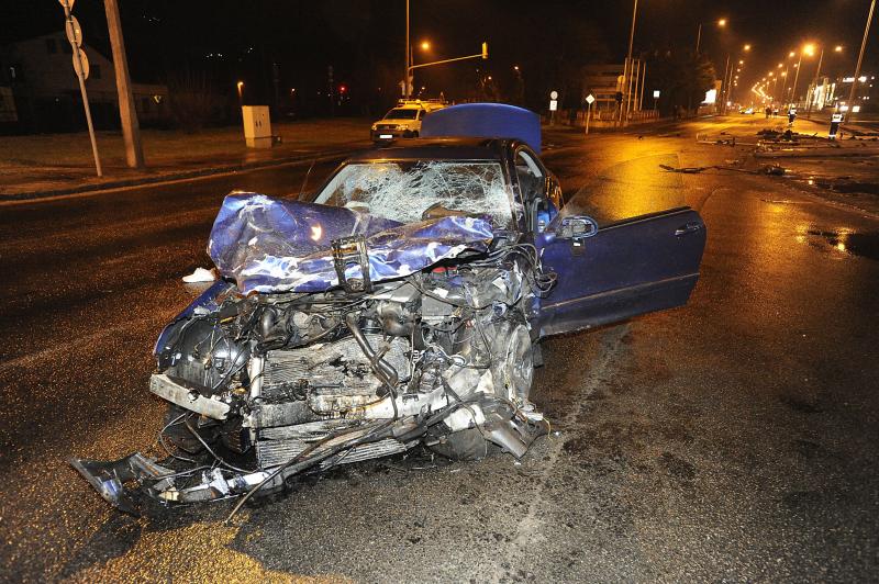 Összetört személygépkocsi a III. kerületben, a Szentendrei úton, miután összeütközött egy másik autóval 2017. március 18-án. A balesetben ketten meghaltak. MTI Fotó: Mihádák Zoltán