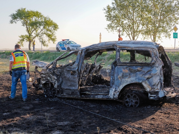 Összetört autó az 54-es főút mellett Bócsa külterületén, miután egy másik gépkocsival ütközött augusztus 5-én. A rendőrség közlése szerint az autó - amelyet valószínűleg egy embercsempész vezetett, aki migránsokat szállított - kigyulladt. A járműben utazók közül ketten az életüket vesztették, és legalább kilencen megsebesültek. MTI/Donka Ferenc