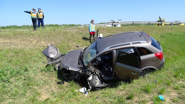 Összeroncsolódott személyautó a 47-es főút hódmezővásárhelyi elkerülő szakaszán 2021. május 4-én. A gépjármű egy másik személygépkocsival frontálisan összeütközött; a balesetben az egyik autó sofőrje meghalt, ketten pedig megsérültek. MTI/Donka Ferenc