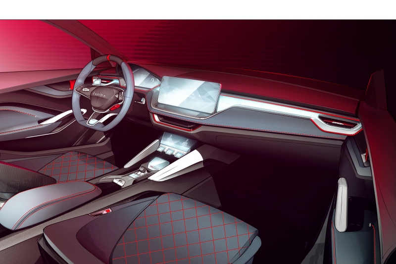 A karimáján a versenysportból ismert középjelölést hordozó sportkormány közepén a teljes utastérre jellemző, apró háromszögek alkotta, markáns szemcsézett felület tűnik fel - amely a márka jövőbeni modelljeiben is a ŠKODA-gének kifejezője lehet.