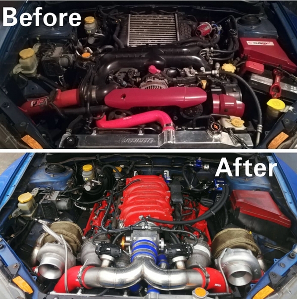 Természetesen nem volt könnyű a nagy motor beépítése az Imprezába, a művelethez jelentősen át kellett alakítani az első segédkeretet, új olajteknőt kellett felszerelni és a nagyobb méretű hűtőnek is helyett kellett találni az első lökhárító mögött. Bár Andrews a szíve szerint megtartotta volna az összkerékhajtást, végül erre nem volt lehetősége, mert meg kellett volna nyújtani hozzá a karosszéria orr-részét, ami túl nagy munkának ígérkezett. Ezért végül kikerült az első hajtás, a Scoobestiának becézett autó így egyszerű hátsókerék-meghajtású lett. Tovább bonyolította a motorcserét, hogy Andrews nem elégedett meg a nyolchengeres szívómotor 280 lóerejével, ezért a turbósítás mellett döntött.