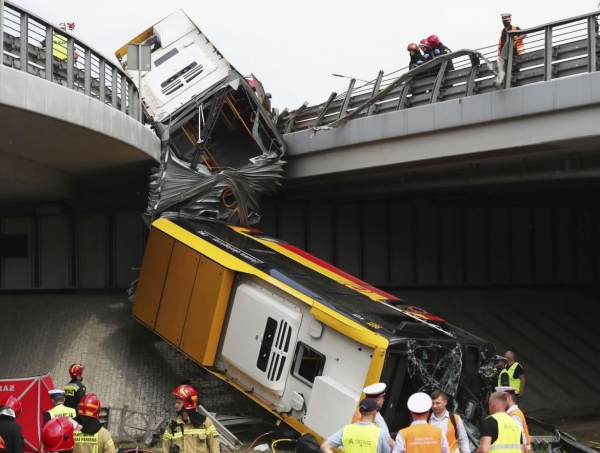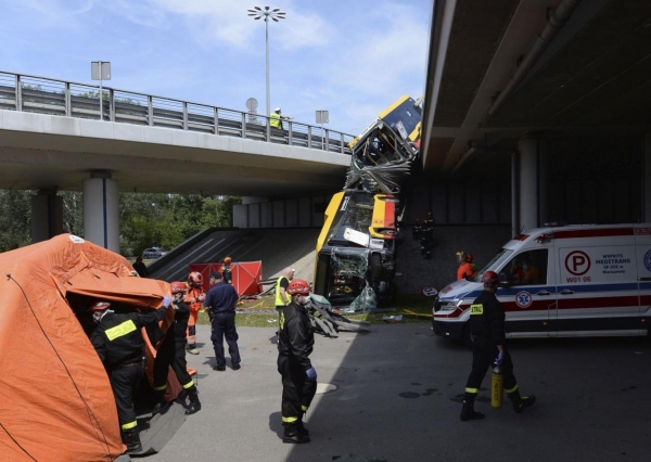 A csuklós busz hátsó része fennakadt a felüljáró korlátján, az elülső rész a viadukt alatt haladó kerékpárútra zuhant. Mentők, légimentők és húsz tűzoltó alakulat szállt ki a baleset helyszínére. A rendőrség kerülőutakra tereli a forgalmat a Gdansk felé vezető főútról.