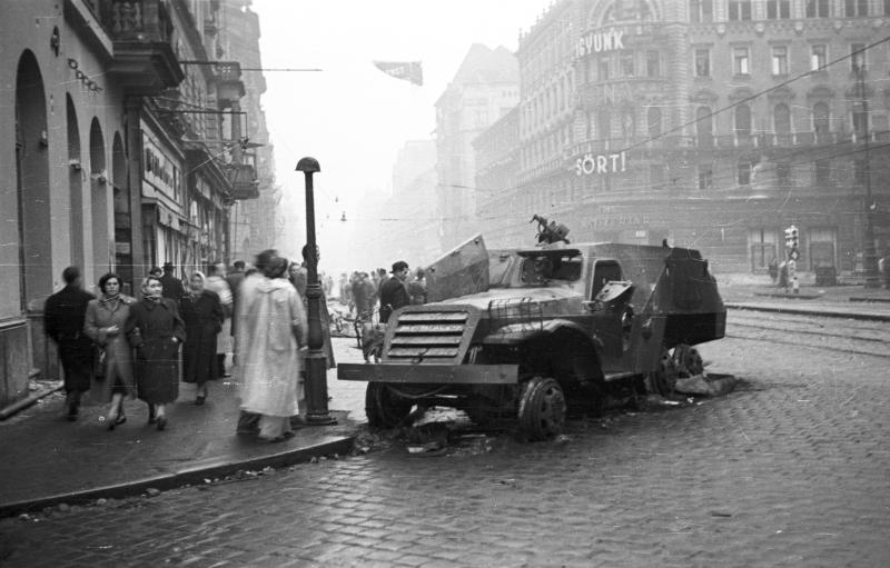 Aztán jött az október 23-i forradalom, a főváros harctérré változott, utcáit katonai járművek uralták, később pedig kiégett, kilőtt roncsok akadályozták a közlekedést, ahogy a felszedett sínek és kockakövek, valamint a felborított buszok és villamosok is. A taxikat mentőnek, a mentőket lőszerszállítónak, a teherautókat busznak használták. A szovjet T34-es és T54-es tankok, a BTR-152-es páncélozott szállítójárművek, valamint a PT-76-os kétéltűek és ISU-152-es lövegek november 11-én végleg megtörték a magyar ellenállást.