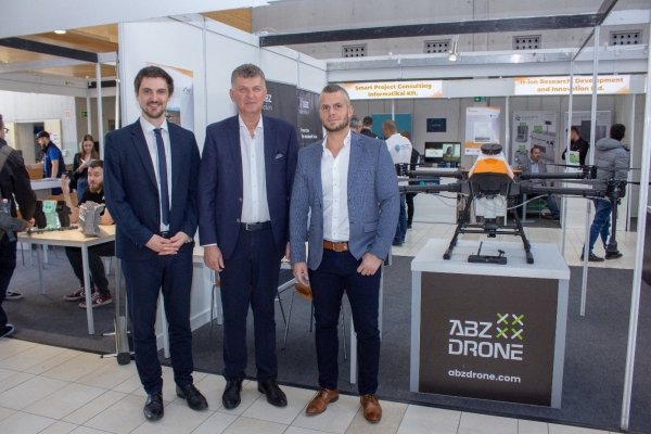 A saját fejlesztésű permetező drónt már a Széchenyi István Egyetem győri kampuszán megrendezett idei Innovációs Kiállításon már láthatták az érdeklődők. A felvételen Drotár István, az egyetem Digitális Fejlesztési Központjának központvezetője, Szekeres István és Török Gyula ügyvezetők az ABZ standjánál. (Fotó: Horváth Márton)