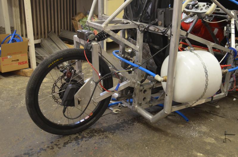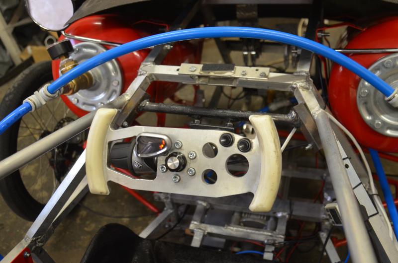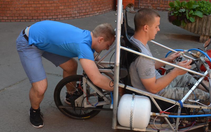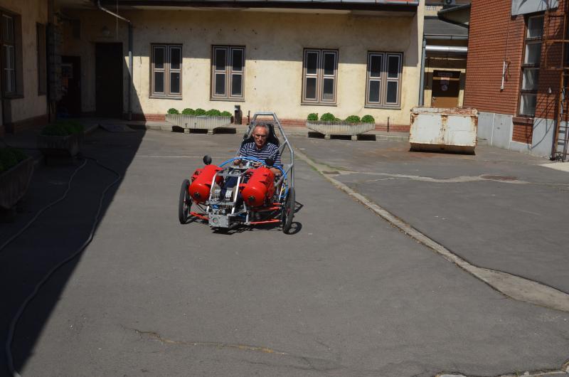 – A sebességet a kormányról gombbal vezéreljük, nem gázt adunk, hanem a 4 különböző programból elindítunk egyet – mondja Gyurita Ákos. Ez azt jelenti, hogy a dugattyú az egyik holtponttól eljut a másikig, jól megforgatva a hátsó kereket. Ezzel el is fogy a szusz, majd jön az újabb gombnyomás és az újabb ütem – ha jól értem. A leglassabb, már-már bolondbiztos programmal a sorok írója is kipróbálta a járművet a mérnöki kar udvarán.