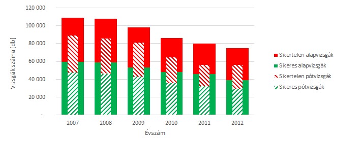 4. ábra Sikeres és sikertelen alapvizsgák és pótvizsgák aránya Magyarországon (2007-2012) (forrás: A kutatócsoport saját szerkesztése az NKH Statisztikai Évkönyve alapján)