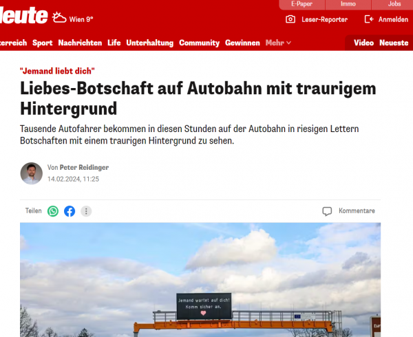 Valentin-nap környékén az autópályákon a kijelzőkön megjelenő új üzenetek elgondolkodtatják a sofőröket. Az autópálya-kezelő ASFINAG olyan üzeneteket jelentetett meg Ausztria-szerte, mint "Valaki vár rád! Érkezz biztonságosan" vagy "Valaki szeret téged. Vezess óvatosan".