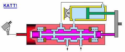 Ha a vezérlőszelepre valamelyik irányban F1 erőt fejtünk ki, az elmozdul, s a két csatorna közül az egyiket megnyitja. Tegyük fel, hogy balról jobbra ható erő érte a vezérlőszelepet. Ekkor a nagynyomású olaj be tud hatolni a középső térbe, s ott növeli a nyomást mindaddig, míg a nyomásnövekedés ki nem egyensúlyozza vezérlőszelepre kifejtett erőt. Ez a nyomásnövekedés természetesen a 3 dugattyúra is hat, s ezért megjelenik egy F2 erő, ami nem más, mint a kívánt szervohatás.