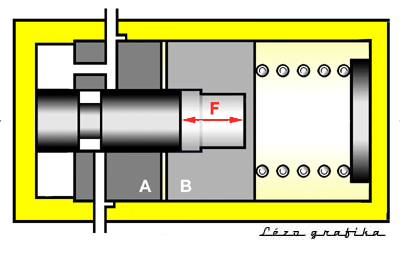 Ha a vezető abba hagyja a befelé való tolást, abban a pillanatban a nagy dugattyú is megáll, s tartós marad az egyensúly: a nagy dugattyúra balról hat egyrészt a gépkocsivezető által kifejett erő (a kis rugó közvetítésével), másrészt az olajnyomás szolgáltatta erő, s e két erő tart egyensúlyt a megnyomott erős rugó erejével.