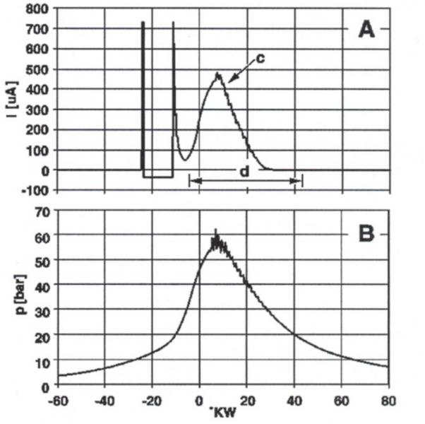 A diagramon az égéstéri nyomás (kiterített indikátordiagram) és az ionáram lefutás látható. Figyeljük meg, hogy a csúcsnyomás maximuma egybeesik a főtengelyelfordulás függvényében az ionáram maximumával. (a gyújtás alatti és közvetlen utáni szakasz ionárama számunkra nem érdekes!)