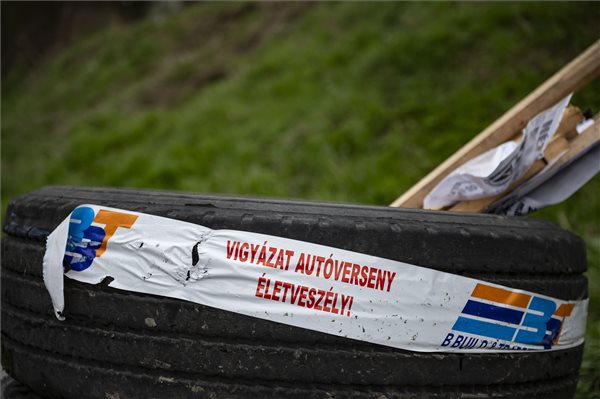 Életveszélyre figyelmeztető felirat gumiabroncsokon az Esztergom-Nyerges Rally helyszínén, Bajót közelében 2024. március 24-én. MTI/Bodnár Boglárka