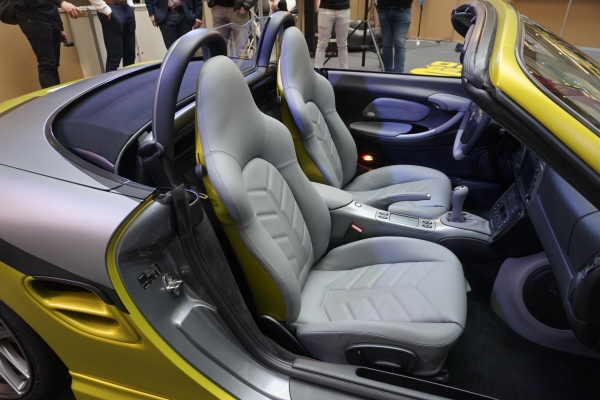 Mivel egy nyitható tetejű autónál elvárás a bőrülés a vízhatlanság miatt, viszont a fekete szín könnyen felforrósodik a napon, a Tibike Bőrike választékából egy világosszürke bőrre esett Noktáék választása. A sportülések és kárpitok, valamint a gyári kormánykerék kárpitozását a Bara Kárpit végezte.