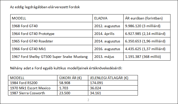 “A legendás Ford GT40 szupersportkocsik teszik ki az eddig legmagasabb áron elárverezett Fordok oroszlánrészét, az új Ford GT pedig minden idők legdrágább Fordjának számít, amihez az is hozzájárul, hogy a típusból mindössze 250 darab készül évente,” mondta el Jim Farley, a Ford Európáért, a Közel-Keletért és Afrikáért felelős elnök-vezérigazgatója. “De sok más izomautónk is lenyűgöző értéknövekedést mutat.”