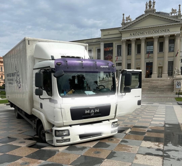 Frissítve: A teherautó egynyári virágokat szállított a Roosevelt térre, majd amikor lepakolták, a sofőr valószínűleg azt gondolta, nem tolat, hanem megfordul. Makrai László, a szegedi szökőkutak üzemeltetéséért is felelős Szegedi Környezetgazdálkodási Nkft. ügyvezető igazgatója a város hirportáljának elmondta, egy megfelelő darut hozatnak a Móra Ferenc Múzeumhoz, ugyanis, ha megpróbálnák kihúzni és elvontatni, akkor elképzelhető, hogy még nagyobb lenne a kár, még több díszburkolati elem szakadna be, és még jobban megrongálódna a szökőkút.