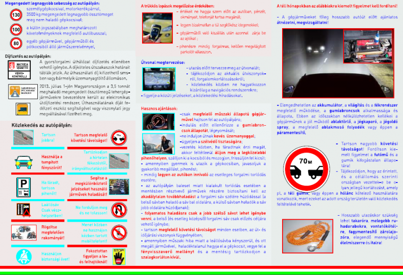 Hogyan közlekedjenek a gyorsforgalmi utakon a téli hónapokban? Melyek azok a legfőbb szabályok és hasznos tudnivalók, melyeket érdemes tudni és megtartani, amennyiben télen közlekednek? Ezekre a kérdésekre ad választ az ORFK-Országos Balesetmegelőzési Bizottság kiadványa, az „Autópálya kisokos”.