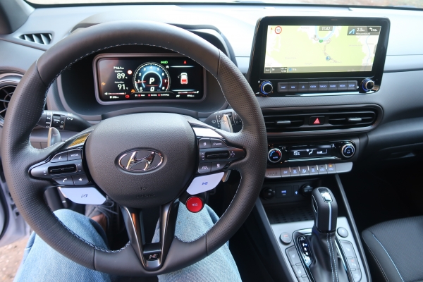 Hogyan működik mindez a gyakorlatban? Nagyszerűen! A kiváló, manuálisan beállítható ülés oldaltartása és komfortja elsőrangú, de figyelembe kell venni, hogy nem nagy autó ez, saját magam (182 cm) mögött nem férek el a második sorban. A rengeteg funkció ellenére nincsenek kezelési rejtvények, egy pillanat alatt kiválasztható a rádióadó, működésbe lép a navigátor, a nagymama is simán elvezeti a Kona N-t. Civil tempónál, a városban, észrevehető, hogy elég feszes a futómű beállítása, de rázósnak azért nem mondanám. Az elektromos szervokormány, a tenyérbe mászó volánnal együtt az egyik legjobb, amelyet próbáltam, abszolúte nincs holtjátéka, érzékenyen reagál, jó visszajelzéseket ad, és nem kelt a kerekektől elszigetelő szintetikus benyomást.