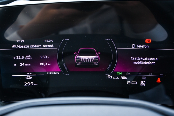 Az egy dolog, hogy ajtócsukáskor végtelen csend lesz úrrá a kabinon, és ez elindulás után is megmarad, de amint egy kátyúsabb útszakaszra érünk, elkezd zajos lenni az egész. Talán a 20-colos felnikkel bánik el nehezebben az elől-hátul multilink futómű, de váratlanul kemény a futómű. Ugyanakkor a legutóbbi Audi tesztem során arra is rájöttem, hogy az Audikhoz meg kell érni, idők kell adni nekik, hogy megmutassák valódi, kifinomult, rabul ejtő arcukat. Szóval hagytam időt, és tényleg volt néhány tulajdonsága, amit lenyűgözött. Például még sosem ültem olyan villanyautóban, ami ennyire pofátlanul hatékonyan tud kigurulni. Mintha nem hatna rá a gravitáció, és sík terepen nem lassul, enyhe lejtőn pedig kifejezetten könnyedén szed össze tempót.