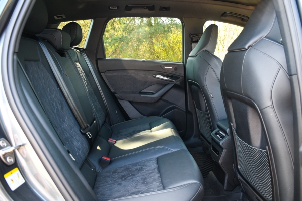 Odabent már kissé vegyesebb a kép. Azonnal megcsap a minőségi bőrillat, amit már megszokhattunk korábbi Audi modellekből. Villanyautó és még SUV is, így hát jó magasra kell ülni, és elkerülhetetlen, hogy ajtócsukáskor ne érintsünk meg legalább néhány gombot az ajtópanelre telepített „okostelefonról”. Ide telepítették még a fényszóró kapcsolókat is. Az alcantarához még mindig borzasztóan ért az Audi, ugyanakkor az üléspozíció korántsem olyan ergonomikus, mint amit megszokhattunk korábban az Auditól. Hiába kényelmesek a sportülések, ez a kabin nem nyel el. Inkább magasan ülünk, túl magasan a középső és az ajtó könyöklőhöz is.