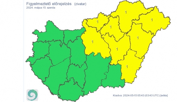 Szöveges és térképes figyelmeztető előrejelzést adott ki Magyarország területére a HungaroMet Nonprofit Zrt. Főként a déli óráktól estig, elsősorban az Észak-Alföldön, az Északi-középhegység térségében, illetve kisebb területen délkeleten zivatarok kialakulása várható, amelyekből néhol viharos (~55-65 km/h) széllökés, esetleg apró szemű jég előfordulhat.