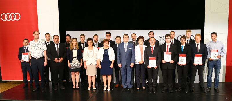 Dr. Knáb Erzsébet, az Audi Hungaria személyügyekért felelős igazgatósági tagja, Marco Reich, az Audi Akademie Hungaria vezetője, valamint Fekete Dávid, Győr város alpolgármestere a 11 legjobb végzőst elismerésben részesítette.