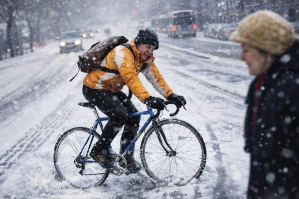 Ónos esőben nem érdemes kerékpározni, akkor még gyalogolni sem biztonságos. A friss hó ellenben nem annyira veszélyes, igaz, az alatta lévő jégborda megvezetheti a kereket. Érdemes kicsit korábban elindulni a váratlan akadályok miatt.