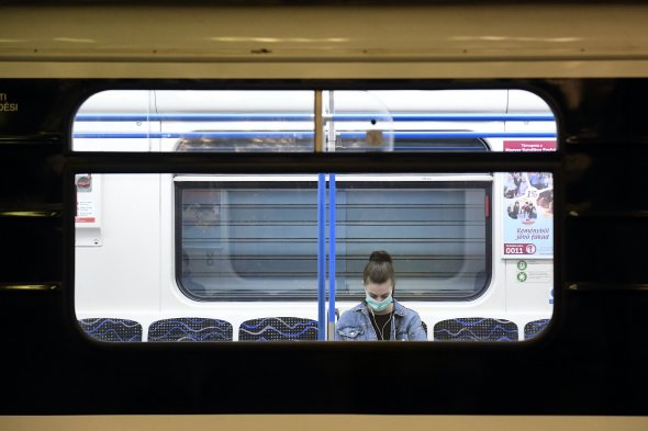 Védõmaszkot viselő utas a 3-as metró Deák téri állomásán 2020. március 19-én. A koronavírus-járvány miatt jelentősen csökkent az utazók száma a közösségi közlekedés járatain (Fotó: MTI/Koszticsák Szilárd)
