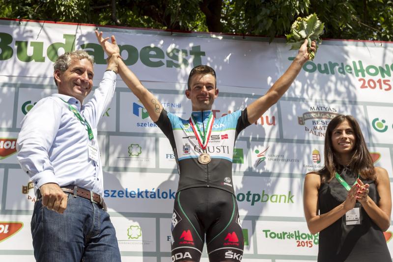 A legeredményesebb magyar versenyző, Lovassy Krisztián a Tour de Hongrie kerékpáros körverseny eredményhirdetésén Budapesten 2015. augusztus 9-én. Jobbra Szalay-Bobrovniczky Alexandra, a humán területért felelős főpolgármester-helyettes, balra Eisenkrammer Károly, a verseny főszervezője. Az idén 90 esztendős Tour de Hongrie-n - amelyet hétéves szünet után rendeztek meg újra - hat nap alatt 700,2 kilométert tett meg a nemzetközi mezőny. Fotó: Szigetváry Zsolt/MTI