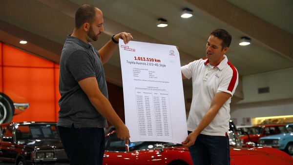 Az ezüstszürke fényezésű Toyota Avensis pont úgy néz ki, mint bármely modelltársa – talán csak az feltűnő, hogy 17 éves korához képest kiváló állapotban van. Nem is gondolnánk, milyen kiválóban: az autóban a mai napig az eredeti motor és sebességváltó dolgozik, de a generátort sem kellett cserélni. Szemmel láthatóan gondját viselték a berlini Motor Company Toyota márkakereskedés szervizében, ahová tulajdonosa az első perctől kezdve hordta. Eddig mintegy 67 alkalommal találkoztak az Avensisszel a szerelők, hiszen a tulajdonos egyszer sem mulasztotta el a 15 ezer kilométerenként előírt karbantartást – az autó a mai napig 1 millió 13 ezer 510 kilométert tett ugyanis meg! Ilyen szélsőséges futásteljesítmény mellett nem csoda, hogy pont a napi kilométer-számláló romlott el a kocsin: 998 ezer kilométer után szép csendben megállt, ám a gondos tulajdonos akkurátusan vezetett menetnaplójában pontosan nyomon lehetett követni az azóta megtett távolságot.