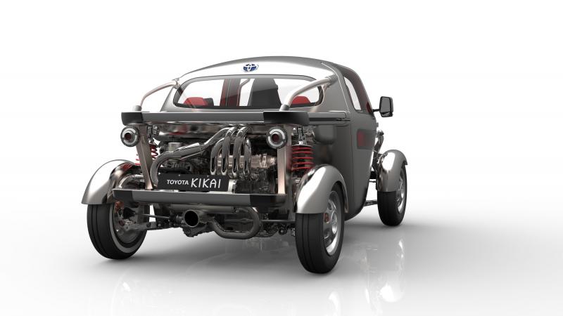 Elöl a KIKAI leplezetlenül tárja a szemlélők elé hűtőjét, kormányművét, fékjeit és elegáns kivitelű, öntött alumínium futómű-komponenseit. Hátul szabad rátekintés nyílik a felfüggesztés elemeire, a fékekre, az üzemanyag-tartályra, a krómozott kipufogó rendszerre, valamint a lenyűgözően csekély helyigényű Toyota Full Hybrid hajtásláncra.