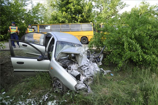 Összeroncsolódott személyautó a Sülysáp és Kóka közötti úton 2018. május 15-én. MTI Fotó: Mihádák Zoltán
