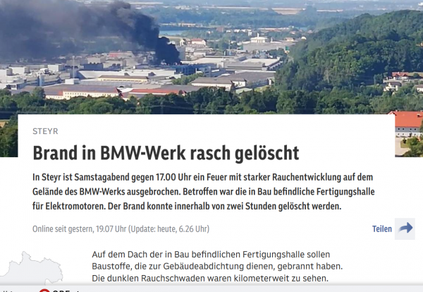 Állítólag az épülő gyártócsarnok tetején égtek az épület lezárására használt építőanyagok. Mérföldekre lehetett látni a sötét füstpamacsokat. A társasági tűzoltóság és Steyr város tűzoltóságának gyors beavatkozásával még nagyobb károkat sikerült megelőzni Gerhard Praxmarer, a steyri tűzoltóság parancsnoka szerint. A művelet körülbelül két órával a riasztás után ért véget.