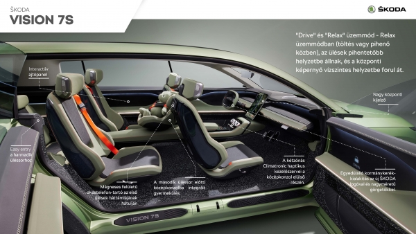 Johannes Neft, a ŠKODA AUTO igazgatótanácsának a műszaki fejlesztés területéért felelős tagja így fogalmazott: „A VISION 7S 89 kilowattórás akkumulátorának köszönhetően több mint 600 kilométer hatótávot kínál és akár 200 kW teljesítménnyel is képes a gyorstöltésre. Ezek a paraméterek jól érzékeltetik, milyen műszaki lehetőségeket kínál a Moduláris elektromos platform. A beltérben az egyéni mobilitás jövőjébe vethetünk pillantást: a különböző szituációkhoz más-más belső konfigurációk állnak rendelkezésre, a gyerekülés a középkonzolba integráltan kapott helyet, a nagyméretű és elfordítható központi kijelző különösen intuitív kezelése pedig valóban iránymutató.”