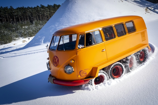Később a gmündi Porsche Museumhoz került a különleges lánctalpas T1, aminek a megtekintését egyébként különösen ajánlom mindenkinek. 1990-ben egy Volkswagen mikrobusz rajongói csapat vásárolta meg, akik Bullikartel e.V. néven futottak. 2005-ben neki is veselkedtek a felújításának, de olyan problémákba botlottak, amik a projekt félbehagyására kényszerítették őket. 2018-ban azonban végre a lehető legjobb helyre került a legendás T1, és a Volkswagen Haszonjármű csapat kezdett el dolgozni rajta, gyári szerszámokkal, gyári alkatrészekből. A felújítást végül a VW klasszikus járművekért felelős csapata fejezte be 2022 februárjában, éppen hatvan évvel a születése után. Úgyhogy a lánctalpas T1 újra havas tájon játszhatott, és a gyáriak szerint a kevés lóerő ellenére elképesztő, hogy mennyire jól képes haladni mély hóban is.