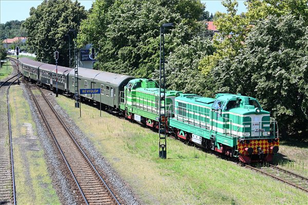 Egy Tapolca irányából érkező M40-es dízelmozdonyokkal vontatott személyvonat érkezik Révfülöp állomásra a balatoni retró hétvégén 2022. július 16-án. MTI/Máthé Zoltán