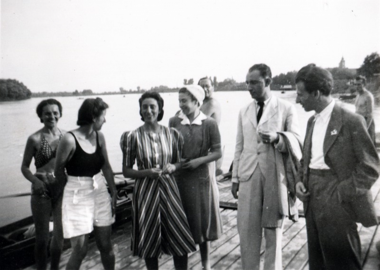 Jó barátok a stégen. Középen, csíkosban Judit, mellette kendőben Fanni, jobb szélen Radnóti