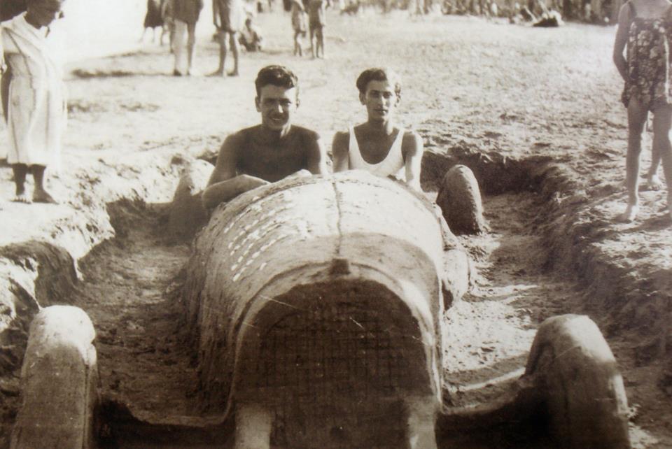 FIAT versenyautó - mint homokszobor az alsógödi Duna-parton. Jobbra az ifjú Radnóti