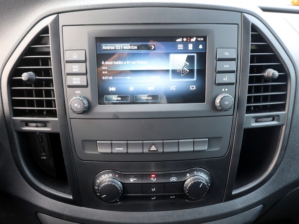 Van egy nagyon egyszerű, de színes képernyős fejegységünk, amely AndroidAuto képes, igaz, csak kábelen keresztül. Mercis félautomata klímánk, elektromos ablakemelőink és tükörállításunk, 2 db frontlégzsákunk, ráfutásérzékelőnk és automata világításunk ködfényszóróval van.