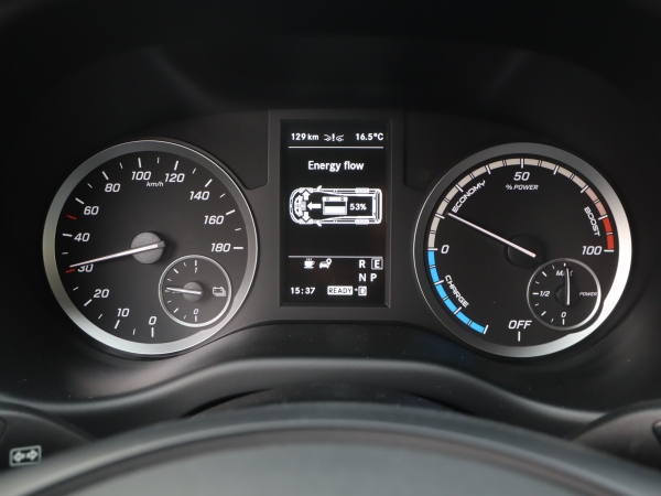 Amit nehéz volt megszokni az csak abból eredt, hogy a tisztán elektromos autókat általában telepakolják innovatív extrákkal, ami itt mind hiányzott. Nem tudom, mikor láttam utoljára tempomat nélküli autót. A kormány pőre műanyag, de legalább jó vastag és a fogása is remek a mintázatnak köszönhetően.