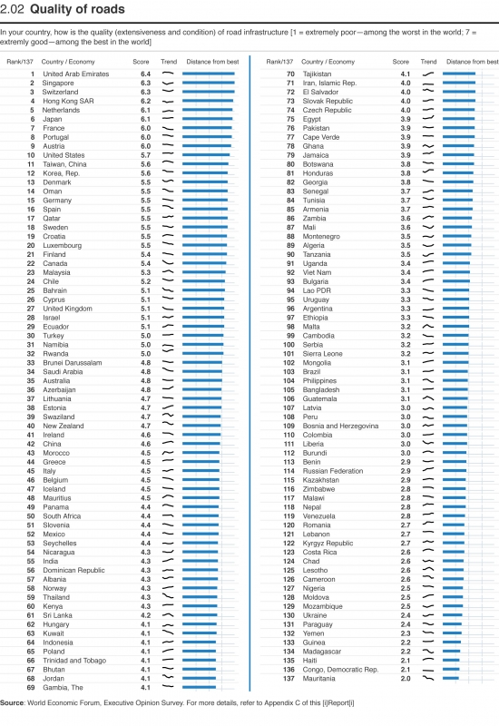 A rangsorban sazereplő 137 ország közül az Egyesült Arab Emírségeké az első hely. Az olajkincséről és gazdaságságáról ismert ország közúthálózata 6,4 pontot kapott a lehetséges 7-ből. Az Öböl-menti országot szorosan követi 6,3 ponttal Szingapúr, az ázsiai régió egyik legfejlettebb gazdaságával rendelkező miniállam.