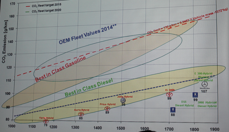Az autógyárak elképesztő küzdelmet folytatnak a folyamatos károsanyagkibocsátás-csökkentést követelő előírásokkal. A CO2-kibocsátásra vonatkozó előírások is folyamatosan szigorodnak, a jelenleg előírt maximum 130 g/km flottaátlag pár év múlva 95 g/km-re csökken, ami tüzelőanyag-fogyasztásra átszámítva 3 liter/100 km körüli értéket jelent.