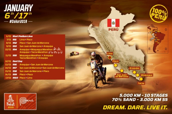 A rajtceremóniát január 6-án, az eredményhirdetést január 17-én tartják Limában. A verseny Peru nyugati és déli részén zajlik majd Lima és Tacna között, összesen 10 gyorsasági szakasz lesz, közülük kettőt (5. és 9.) tömegrajttal fognak indítani a sivatagban, ami látványosnak ígérkezik. Az össztáv 70 százalékát sivatagokban jelölték ki, így azok lesznek előnyben, akiknek fekszenek a finom homokos dűnék és a nyílt terep.