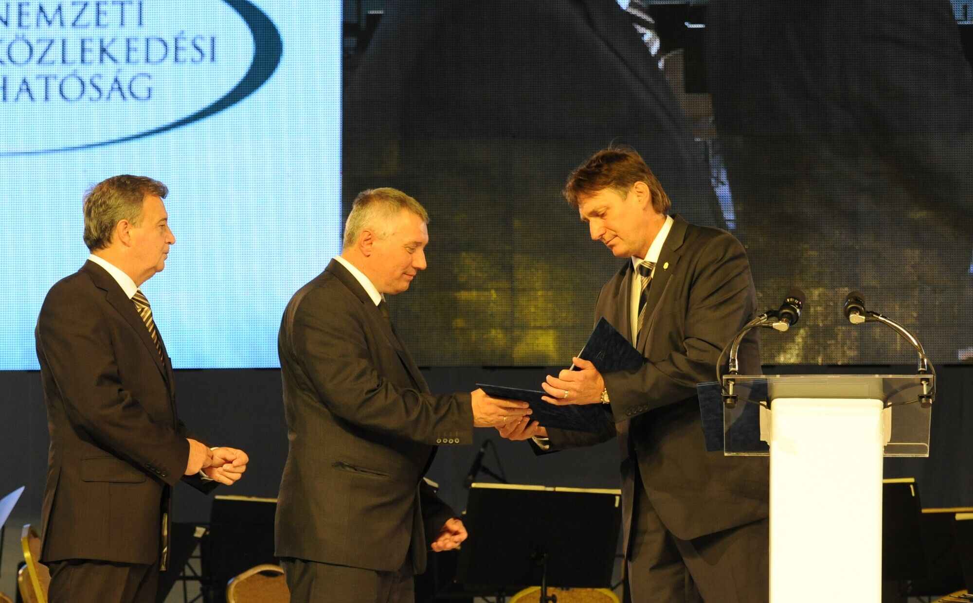 Zaránd György, a MÁV-START Zrt. vezérigazgatója és Pál László, a MÁV Zrt. általános vezérigazgató-helyettese átvették Bíró Józseftől, a Nemzeti Közlekedési Hatóság elnökhelyettesétől a Vasútbiztonsági tanúsítványt