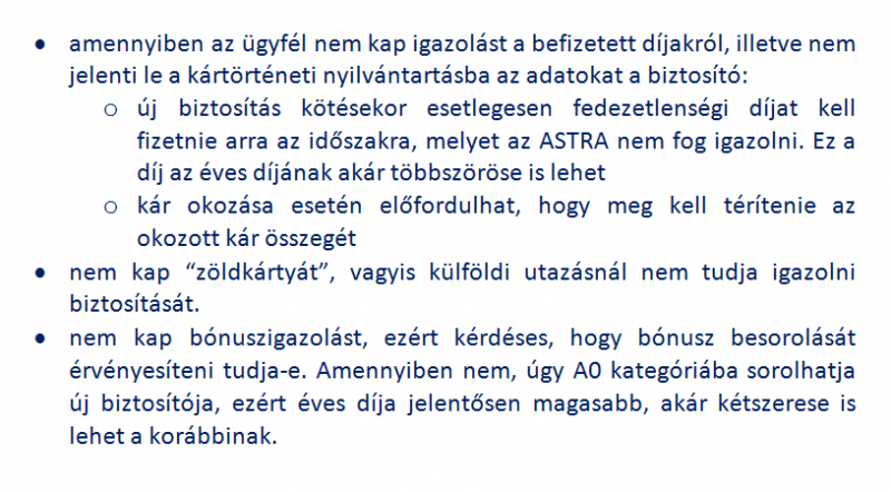 “A biztosítóváltás elmulasztása jelentős kockázatokat hordoz az érintett ügyfeleknek. Bár – a tevékenységi engedéllyel már nem rendelkező – ASTRA Biztosító felszámolását az illetékes román legfelsőbb bíróság még mindig nem rendelte el, a magyarországi fióktelep tájékoztatása szerint 2015. december 1-étől a biztosítási tevékenységhez kapcsolódó szolgáltatásokat már nem tudja teljesíteni (díjigazolást és zöldkártyát nem tud kiadni, a díjakat nem könyveli le, a kártörténeti nyilvántartásba sem tud adatokat jelenteni), illetve a kgfb-s károkat sem téríti meg (forrás: MNB)”