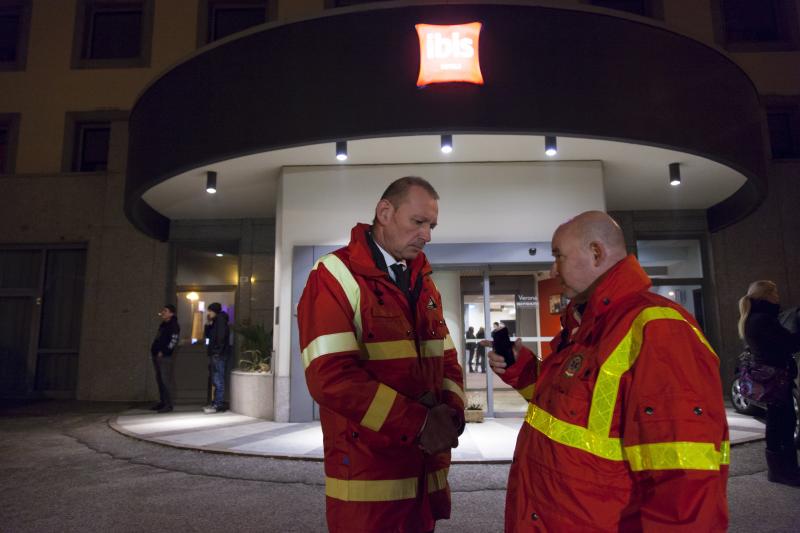 Győrfi Pál, az Országos Mentőszolgálat (OMSZ) kommunikációs vezetője (b) és Pék László, a szervezet orvos igazgatója az előző napon este történt buszbaleset könnyű sérültjeinek szállást adó veronai szálloda előtt 2017. január 21-én. Fotó: Varga György/MTI