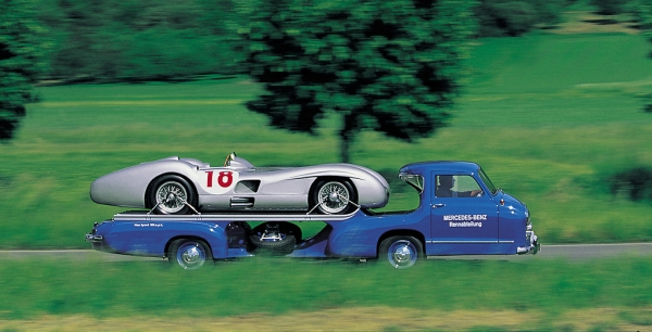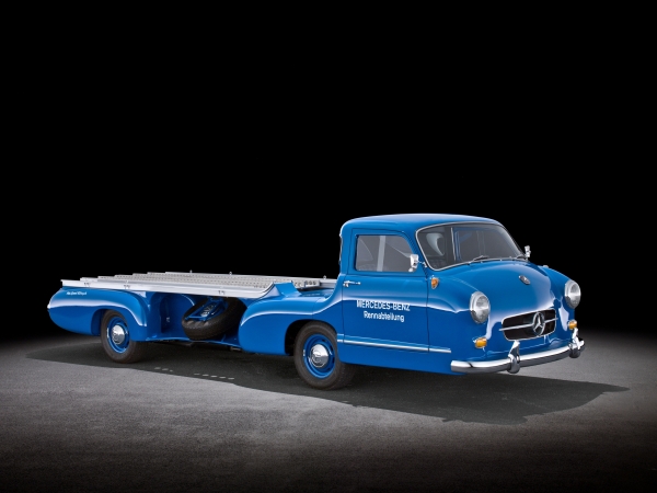 A különleges jármű 1955-ben készült a legendás csapatfőnök Alfred Neuebauer kívánságára, hogy ezzel is jelezze a Mercedes versenyosztály és német autósport különlegességét. A hagyományos zárt dobozos szállítás helyett a tréler mozgó autóreklámként közlekedett az utakon.